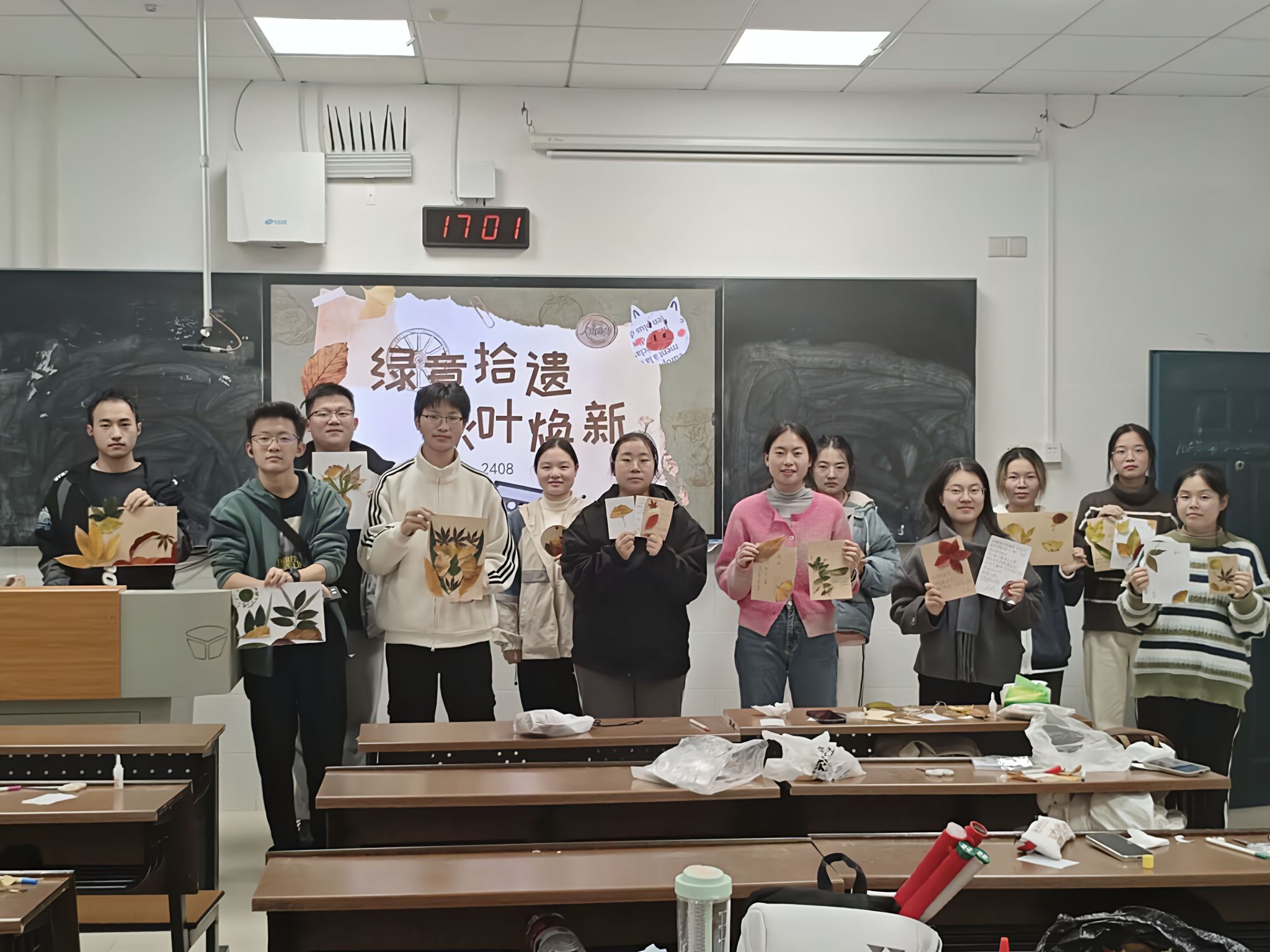 活动期间,2408班的同学们积极参与,通过捡拾落叶和制作落叶创意小手工,践行了环保行动。同学们收集了五彩斑斓的秋叶,在至善楼115教室动手制作了落叶画、书签等手工艺品,将自然界的植物化为具有人文意蕴的美学作品。活动中,同学们分工合作,有的负责挑选和清洗落叶,有的负责设计图案,还有的负责最后的装裱工作,每个人都在积极地创作精美的落叶创意小手工。